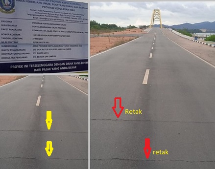 Proyek pembangunan jalan Caostal Area, Karimun, bernilai Rp14,6 miliar, TA 2022, terlihat mulai terjadi keretakan.